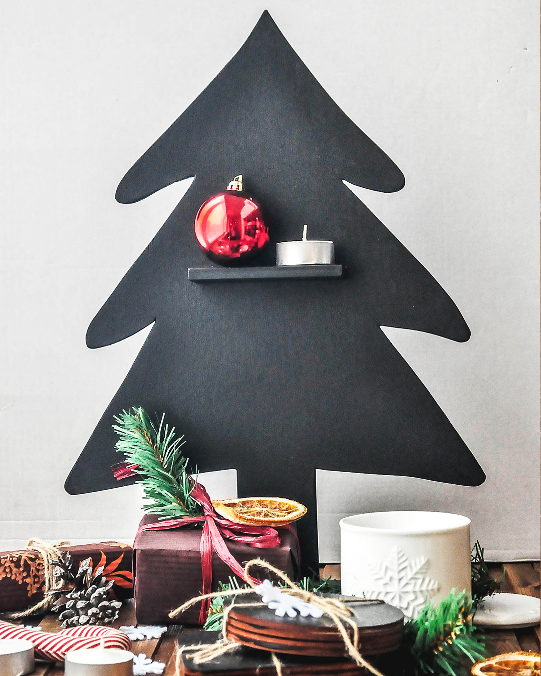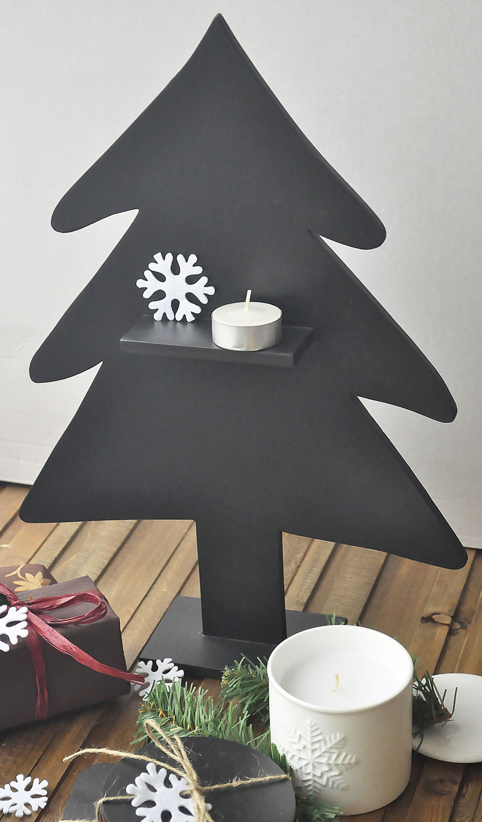 Настольная елочка с полочкой для декора (можно повесить гирлянду, поставить свечку или положить елочный шарик). Окрашена в черный цвет грифельной краской, на елочке можно рисовать мелками. Мелок в комплекте. Сухая и влажная чистка. Беречь от огня! Устойчивая подставка. Высота елочки 30 см.